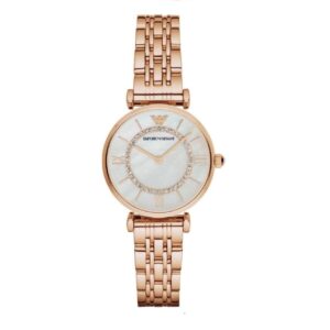 Emporio Armani AR1909 is a unique vision of elegance embodied in a rose gold bracelet and matching case and enhanced by a subtle mother of pearl dial and delicate inlay. The Roman numerals on the hour markings add gravitas. The scratch resistant dial is protected by a mineral glass. Powered by Quartz. This timepiece will become a great complement to your everyday clothing or an eye-catching staple on dressing party that will add refinery and air to your look.”