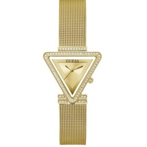 Chic and unconventional, the GUESS GW0508L2 is a standout accessory featuring a bold triangular case design in a radiant yellow gold-tone finish. Measuring 34mm, the polished gold case is paired with a sleek gold-tone dial and a matching stainless steel mesh strap for a sophisticated, unified look.