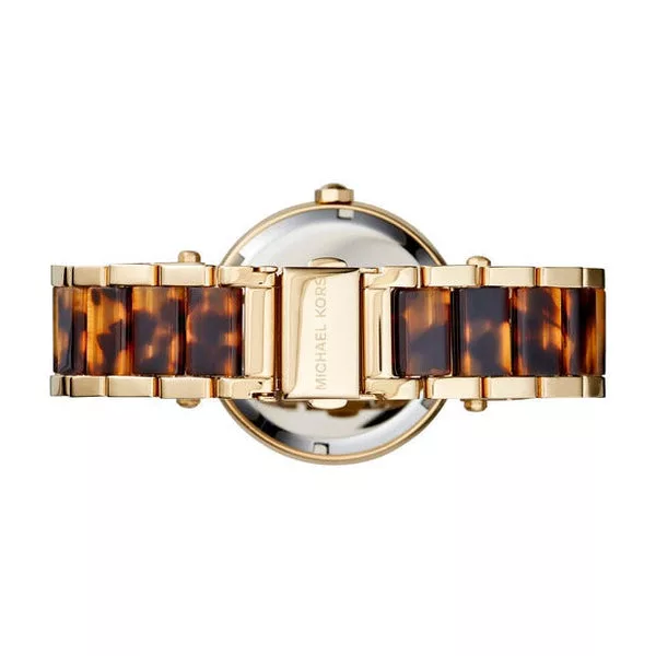 Michael Kors MK6109 Parker Champagne Dial Watch for women comes in gold-tone stainless steel case with a gold-tone stainless steel bracelet and tortoise-shell acetate center links. Fixed gold-tone bezel set with crystals. Champagne dial (oversized MK logo) with gold-tone hands. No markers. Scratch-resistant mineral crystal. Casual watch style.