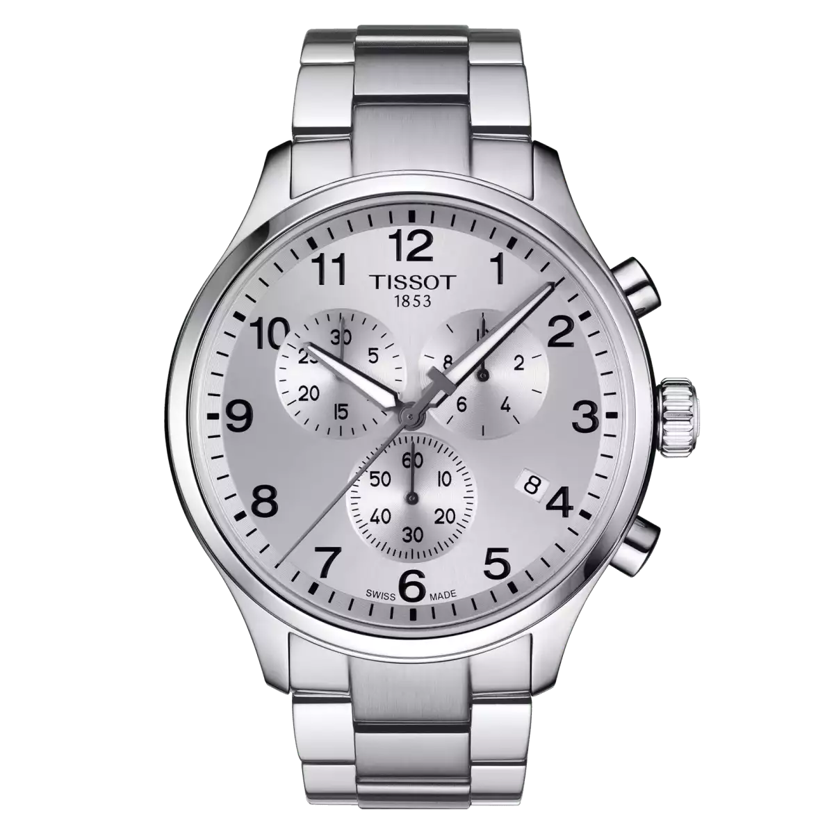 The silver dial is complemented by contrasting black Arabic numerals and luminous hands for enhanced readability. Powered by a reliable Swiss quartz movement, the watch delivers precision timekeeping. It is paired with a stainless steel bracelet secured by a folding clasp with a safety release. With a water resistance of up to 100 meters (10 ATM), the Tissot Chrono XL Classic is suitable for everyday wear.