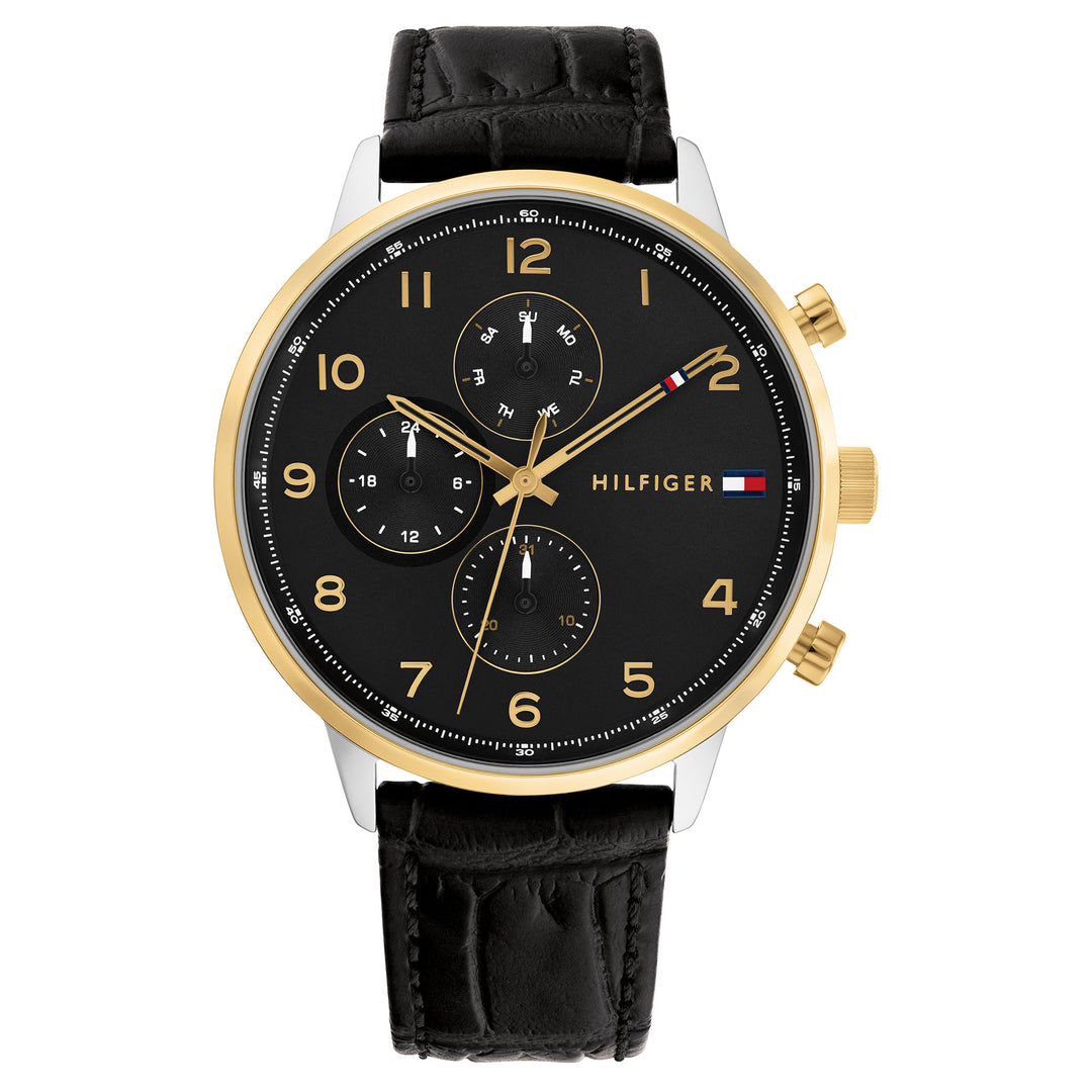 Enhance your style with the Tommy Hilfiger TH1791986 Analog Black Dial Men’s Watch. The black leather band, 21mm in width, offers both comfort and sophistication, secured with a tang buckle.